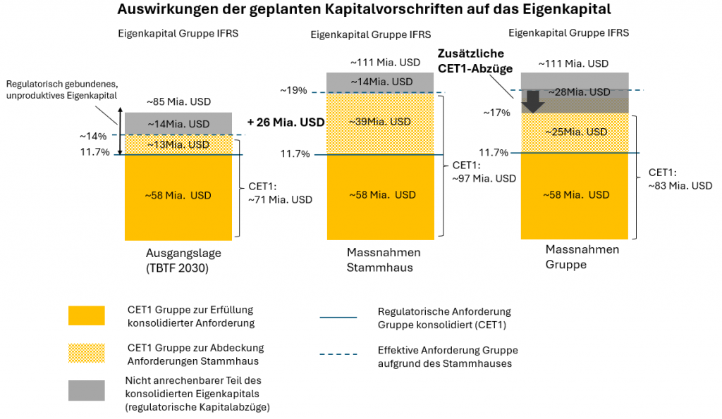 Besonders ausgeprägt zeigt sich diese Problematik im Fall der UBS, da die geplanten Kapitalanforderungen auf Ebene des Stammhauses dazu führen würden, dass die Bank auf Konzernebene eine CET1-Quote von 19 Prozent ausweist, die deutlich über den für die konsolidierte Gruppe geltenden Mindestanforderungen liegt. Bereits heute bewirken die Vorgaben für das Stammhaus als Einzelinstitut, dass die UBS auf Gruppenebene faktisch eine CET1-Quote von rund 14 Prozent ausweist, wenn sie sämtliche Kapitalvorschriften auf nachgelagerten Konzernstufen erfüllt.